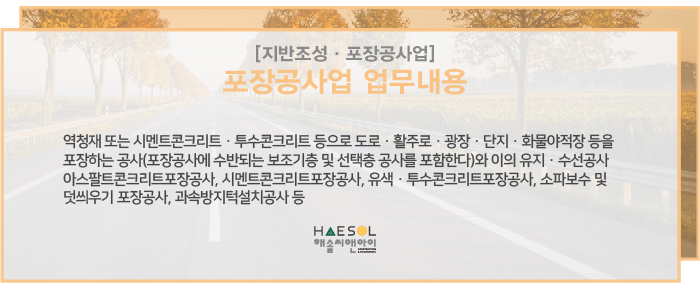 지금까지 지반조성포장공사업 주력분야 중 하나인 포장공사업 면허 등록에 대한 기준에 대해 설명드렸습니다.