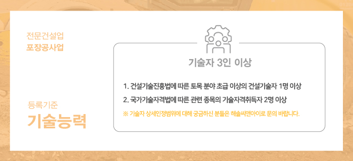 포장공사업은 총 3인 이상의 기술자격취득자가 준비되어야 합니다.