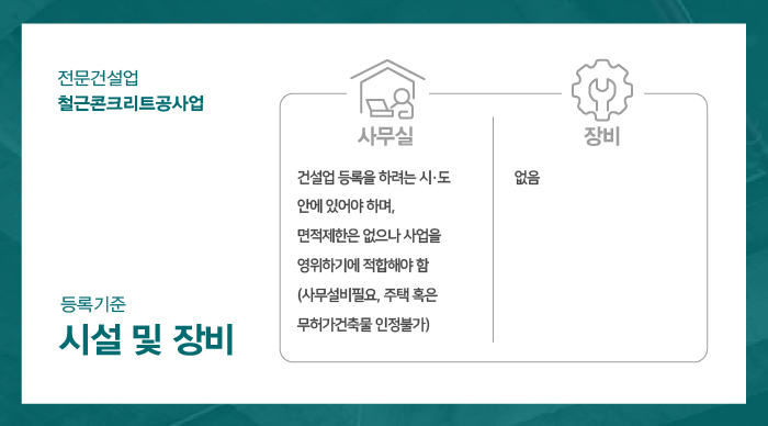 철근콘크리트공사업은 장비에 대한 기준은 없으나 사무실이 기본으로 준비되어야 합니다.