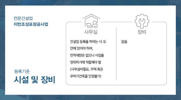 지반조성포장공사업은 장비 기준은 없으나 사무실이 기본으로 준비되어 있어야만 합니다.