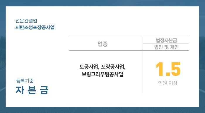 지반조성포장공사업은 1.5억 이상의 자본금이 준비되어 있어야 합니다.