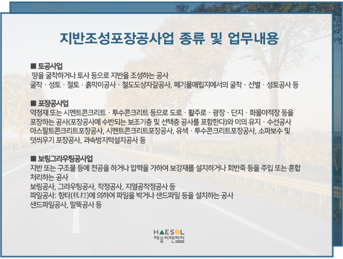 오늘은 전문건설면허 중 하나인 지반조성포장공사업의 주력분야별 등록기준에 대해서 알아보도록 하겠습니다.