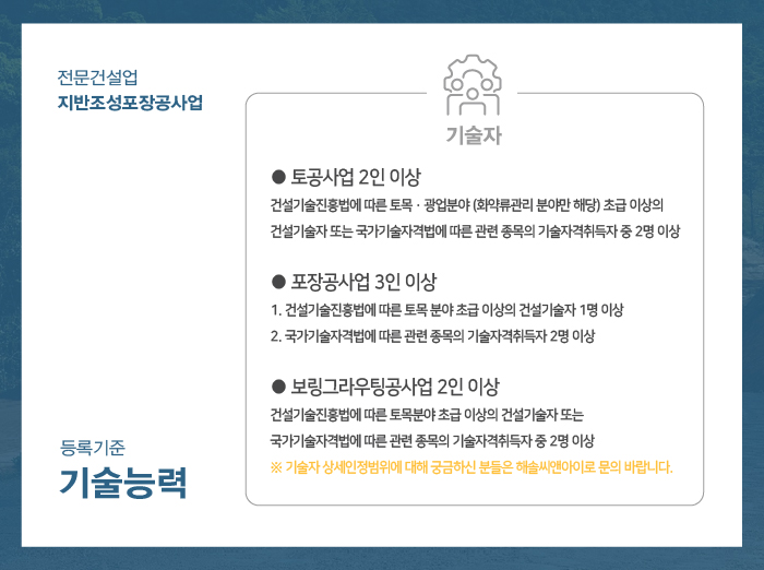 지반조성포장공사업은 주력분야에 맞는 기술자격취득자가 준비되어야 합니다.