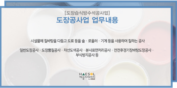 도장공사업은 표에 기재된 것 처럼 시설물에 칠바탕을 다듬고 도료 등을 솔, 로울러, 기계 등을 사용하여
