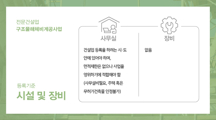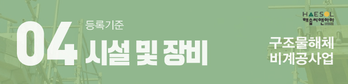 구조물해체비계공사업은 장비 기준은 없으나 사무실이 기본으로 준비되어 있어야 합니다.