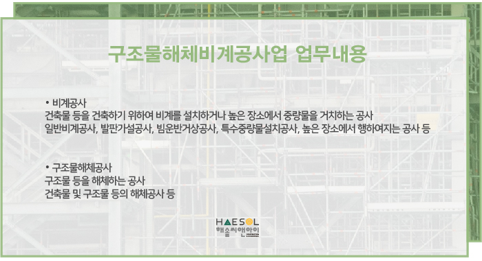 오늘은 전문건설면허 중 하나인 구조물해체비계공사업 면허 등록을 위한 기준에 대해서 알아보도록 하겠습니다.