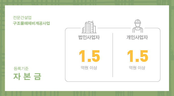 구조물해체비계공사업은 1.5억 이상의 자본금이 준비되어 있어야 합니다.