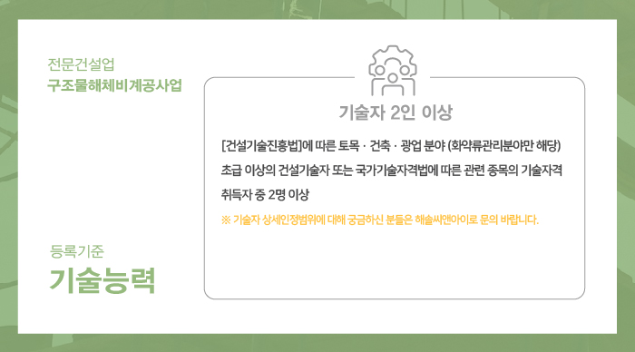 구조물해체비계공사업은 총 2인 이상의 기술자격취득자라 준비되어 있어야 합니다.