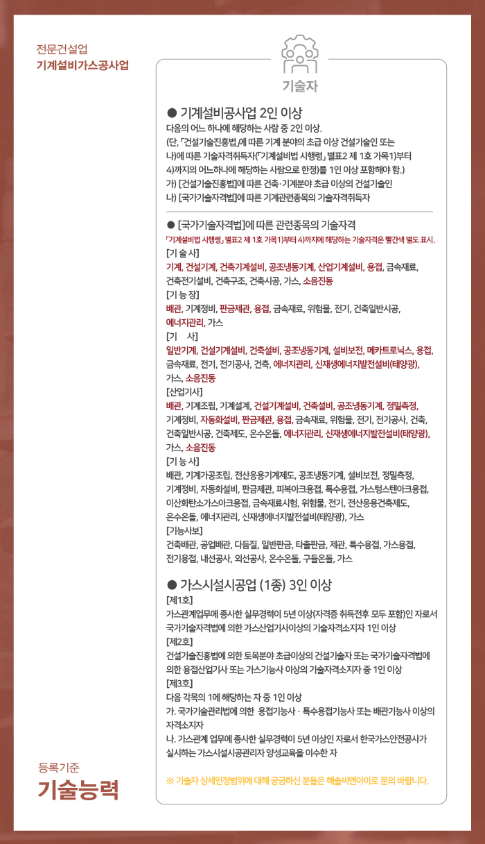 기계설비가스공사업은 주력분야에 맞는 기술자격취득자를 준비하셔야 합니다.