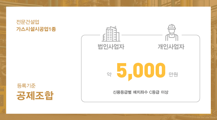 가스시설시공업 1종은 약 5,000만원의 출자금을 기계설비건설공제조합에 예치하셔야 합니다.