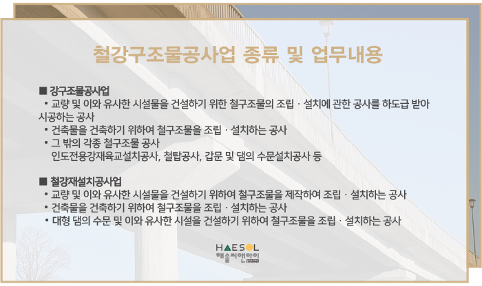 철강구조물공사업은 강구조물공사와 철강재설치공사업이 통합된 면허를 말하며,