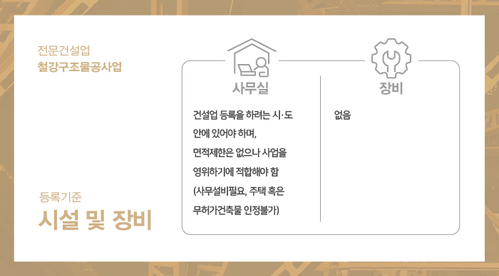 철강구조물공사업은 장비 기준은 없으나 기본적인 사무실은 준비되어야 합니다.