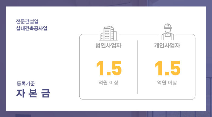 실내건축면허는 1.5억 이상의 자본금이 준비되어 있어야 합니다.