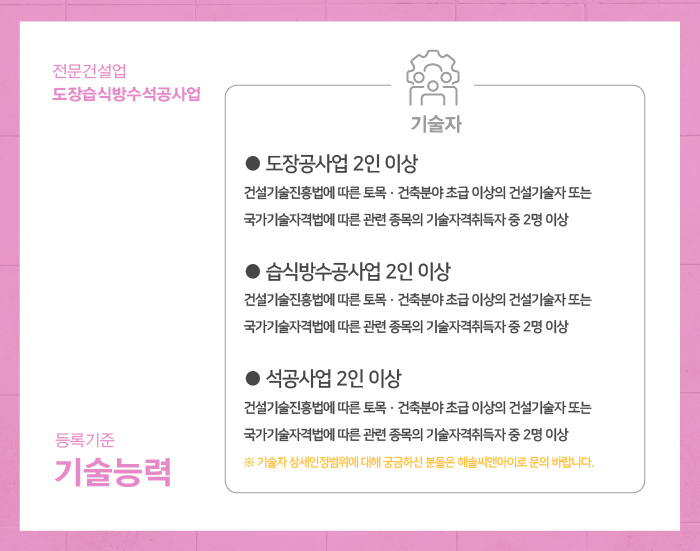 도장습식방수석공사업은 주력분야에 맞는 기술자격취득자를 준비하셔야 합니다.
