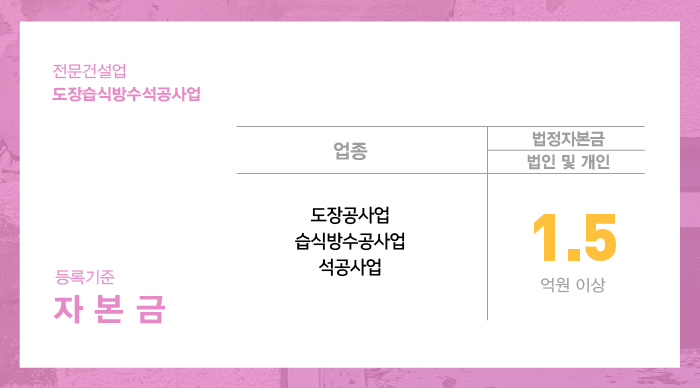 도장습식방수석공사업은 1.5억 이상의 자본금이 준비되어 있어야 합니다.